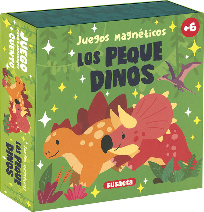 En esta caja de la colección Juegos magnéticos encontrarás un divertido juego, con fichas e instrucciones, y un simpático cuento sobre dos pequeños y traviesos dinosaurios, que podrás llevar a donde tú quieras.